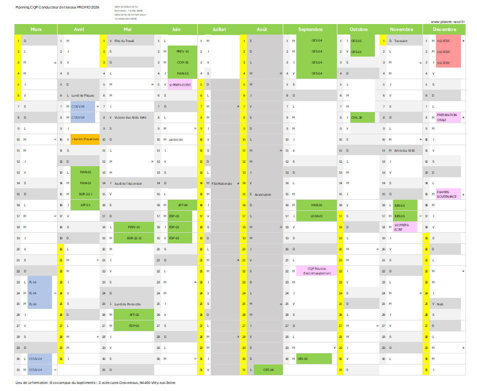 Prochaine session : du 10 avril au 15 décembre 2026. Les inscriptions sont ouvertes. Contactez Inès LE BRETON, Tel : 01 81 72 71 87 – ilebreton@afortech.com ; ou Brigitte PALLU, Tel : 06 11 46 19 13 – bpallu@afortech.com. Rythme en alternance. CQP Conducteur de travaux, RNCP 35426, niveau 6 (équivalent Bac + 3). Eligible à des financements Constructys, Parcours de Transition Professionnelle (PTP) ou CPF. Formation à l’Eco-Campus du Bâtiment, à Vitry. Ci-contre un aperçu du planning des stages en alternance.