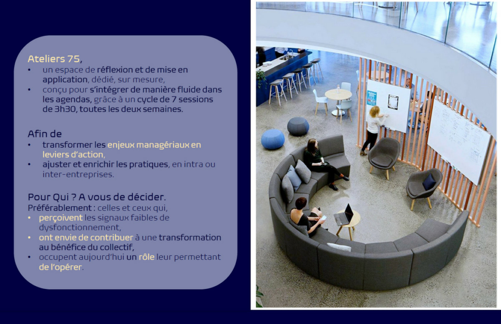 L’idée est que, par petit groupe de 6 personnes, en inter ou en intra entreprise, ces ateliers se déroulent sur une demi-journée toutes les deux semaines. L’idée est de permettre d’inclure facilement ces moments de réflexion dans les agendas. Ils auront lieu dans un endroit confortable, pour qu’une prise de recul y soit propice.