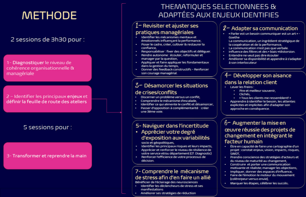 Ils représentent un cycle de 7 sessions (3h30 toutes les deux semaines) pour diagnostiquer, transformer et ajuster les pratiques managériales. Ils se composent de 2 sessions de base pour commencer :