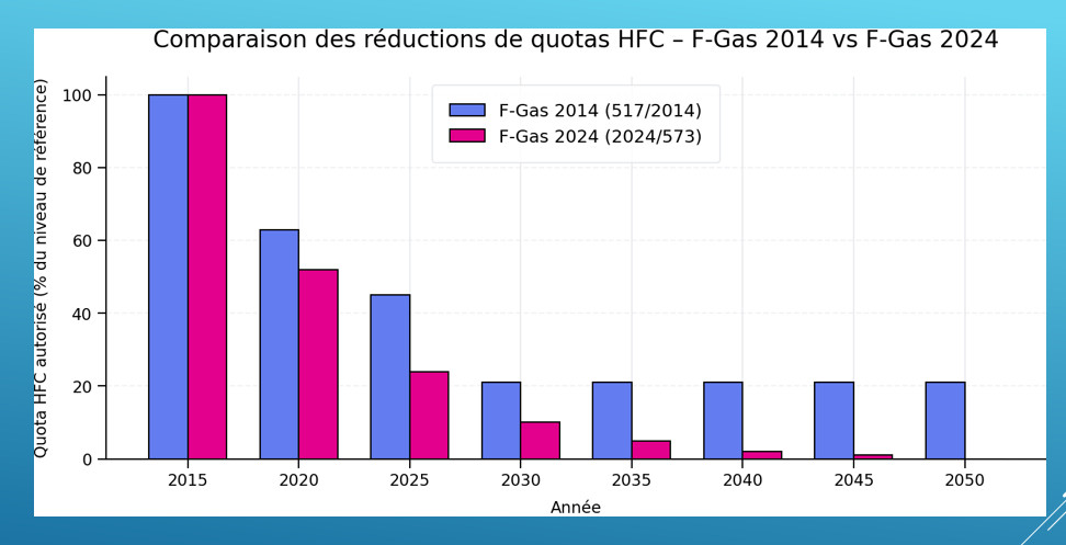 Depuis le 1er janvier 2025, la réglementation européenne F-GAS III (RE 2024/573) accélère la réduction des quotas de fluides frigorigènes HFC à fort Potentiel de Réchauffement Planétaire (PRP).