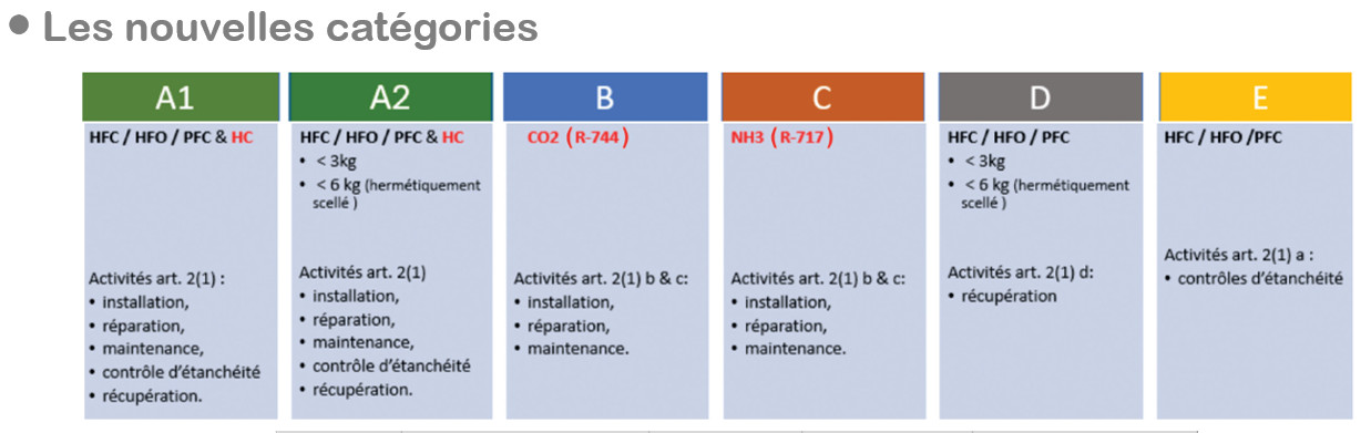 Tout d’abord, les catégories de gaz fluorés ne sont plus les mêmes. Ainsi les formations et les habilitations évoluent et s’adaptent à l’intégration de nouveaux fluides, pour permettre aux professionnels de se certifier sur ces nouvelles pratiques. Ci-dessous le schéma de ces nouvelles catégories, qui s’étendent aux nouveaux fluides : les hydrocarbures : exemple R290/propane, le CO2/R-744 et le ­NH3/R-717 Ammoniac.